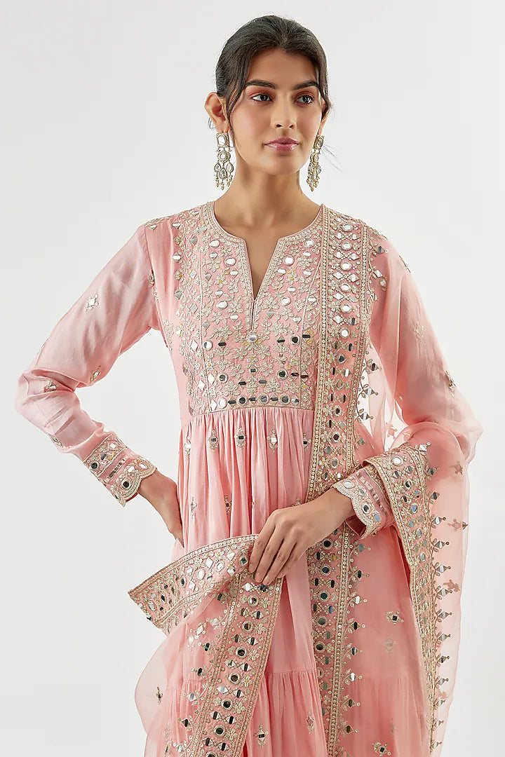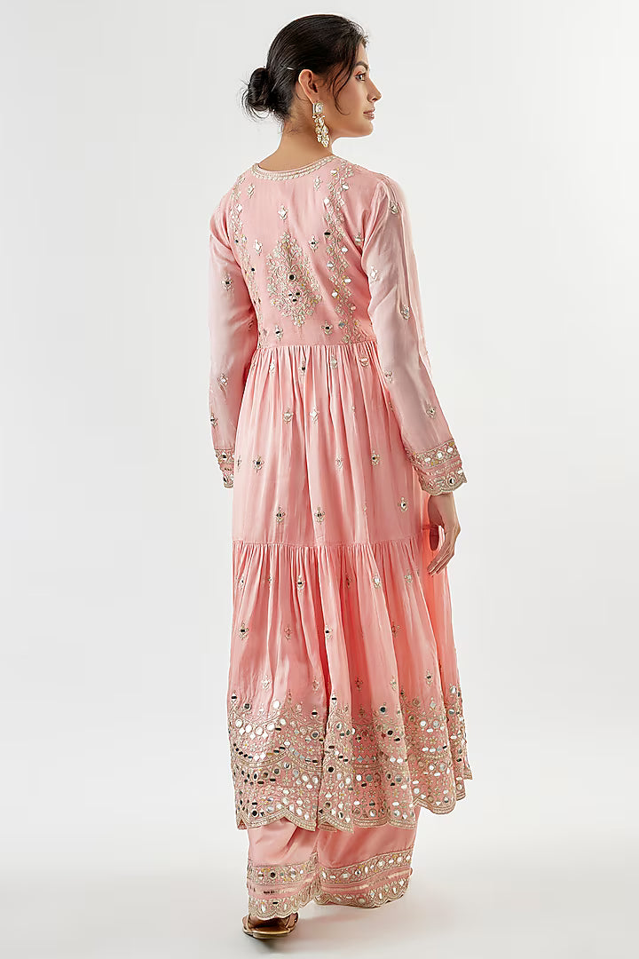 The outfit features a long, flowy silhouette with intricate mirror work and embroidery adorning the yoke, sleeves, and hemline. Includes sharara and dupatta with a scalloped border, heavily detailed with shimmering mirror accents and embroidery.