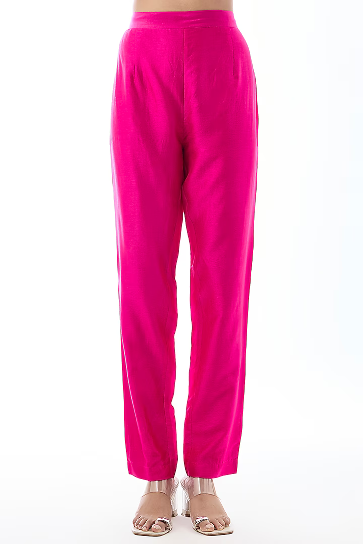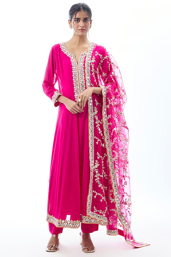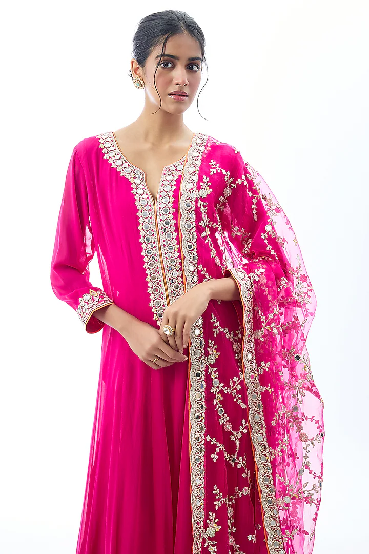 Featuring a anarkali in georgette base with embroidery. It is paired with tussar slim-fit pants and an organza dupatta. Pair it with jewellery and heels for a glamorous appeal, Perfect for wedding ceremony or festive occasions.