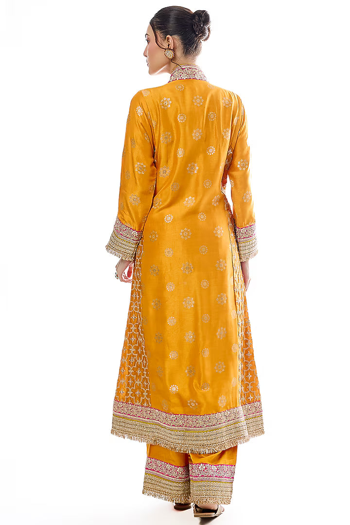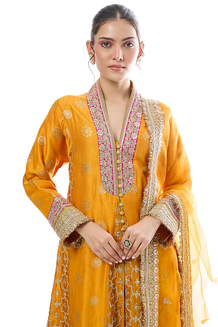 The longline silhouette features intricate motifs all over, paired with a contrasting patterned panel that adds depth and elegance to the design. The neckline and sleeve edges are richly embellished while the hemline is adorned with an ornate border, lending a regal finish.Completed with an organza dupatta.
