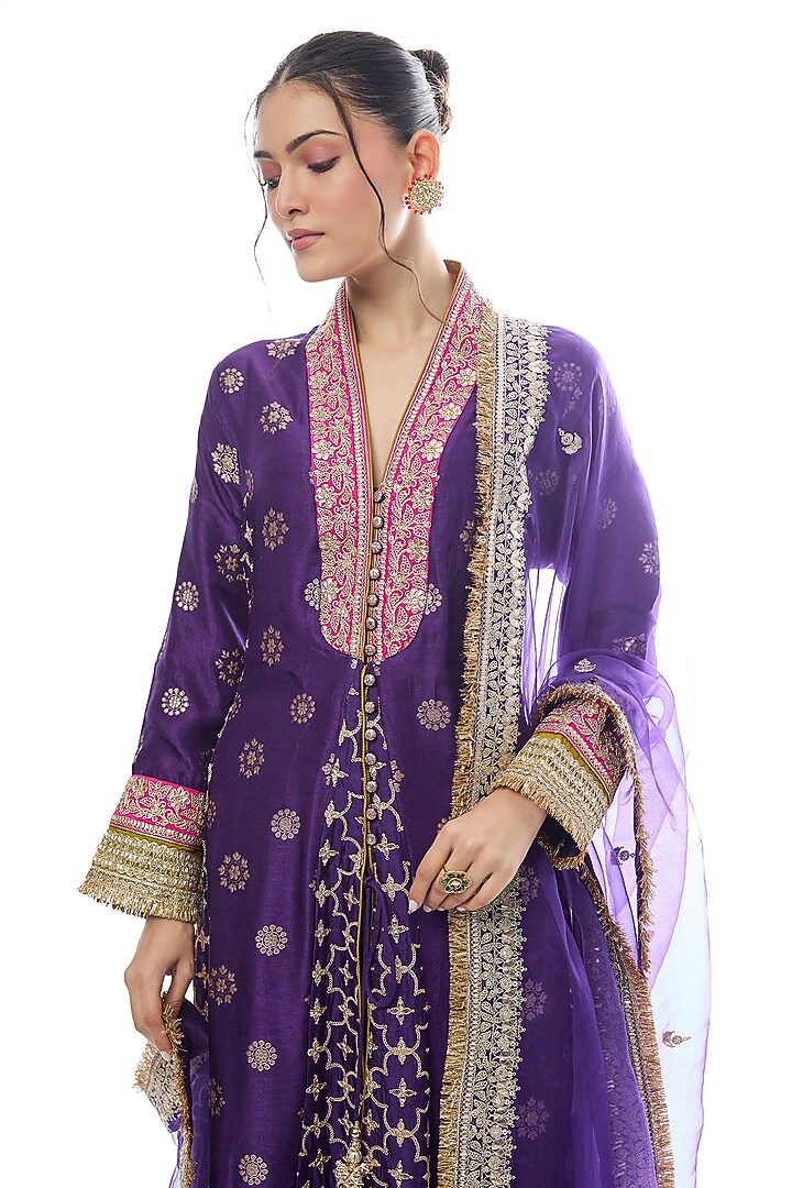 The longline silhouette features intricate motifs all over, paired with a contrasting patterned panel that adds depth and elegance to the design. The neckline and sleeve edges are richly embellished while the hemline is adorned with an ornate border, lending a regal finish.Completed with an organza dupatta.