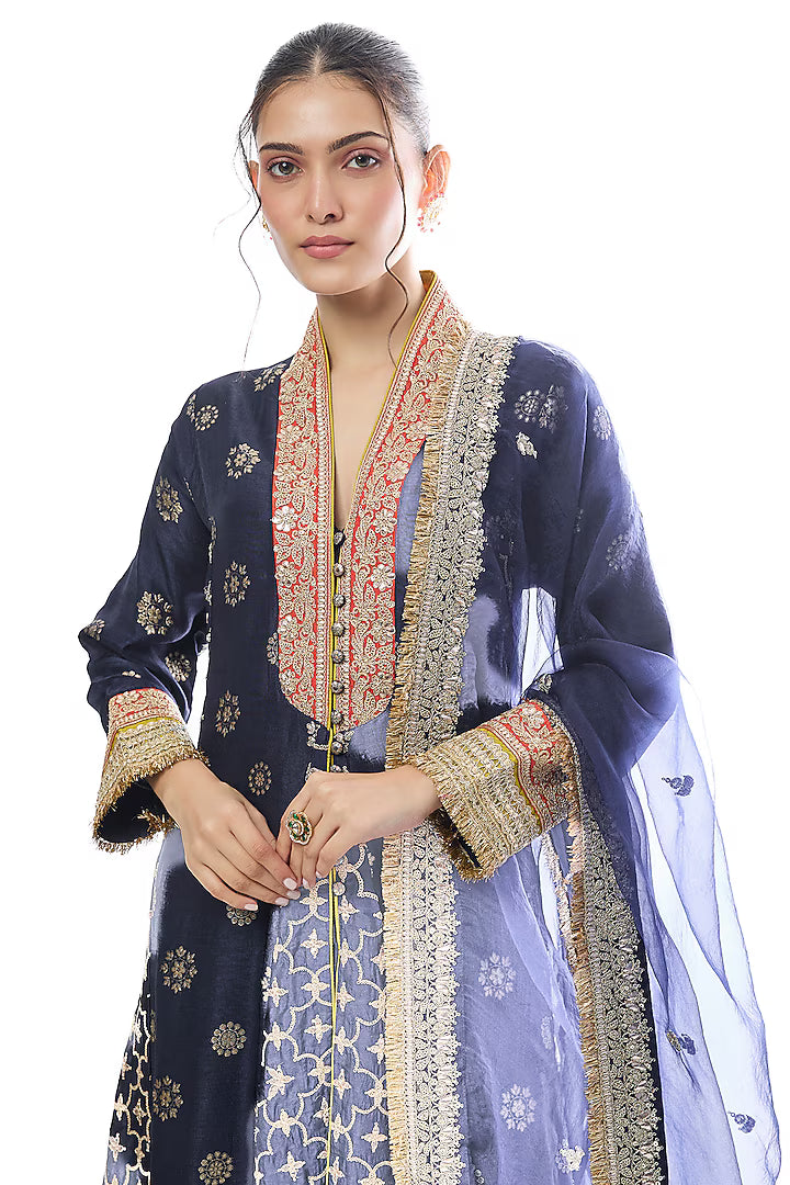 The longline silhouette features intricate motifs all over, paired with a contrasting patterned panel that adds depth and elegance to the design. The neckline and sleeve edges are richly embellished while the hemline is adorned with an ornate border, lending a regal finish.Completed with an organza dupatta.