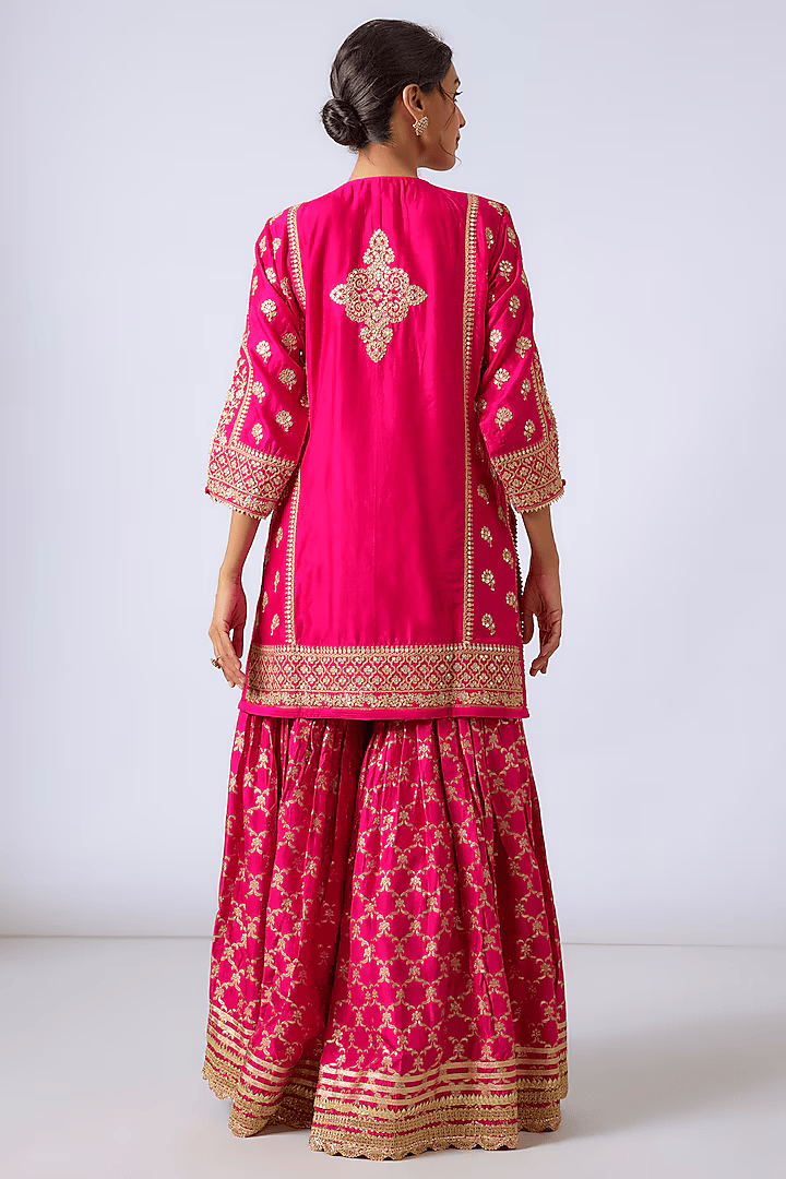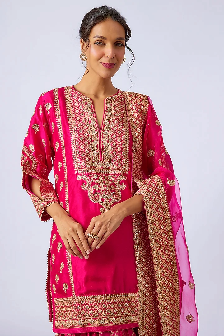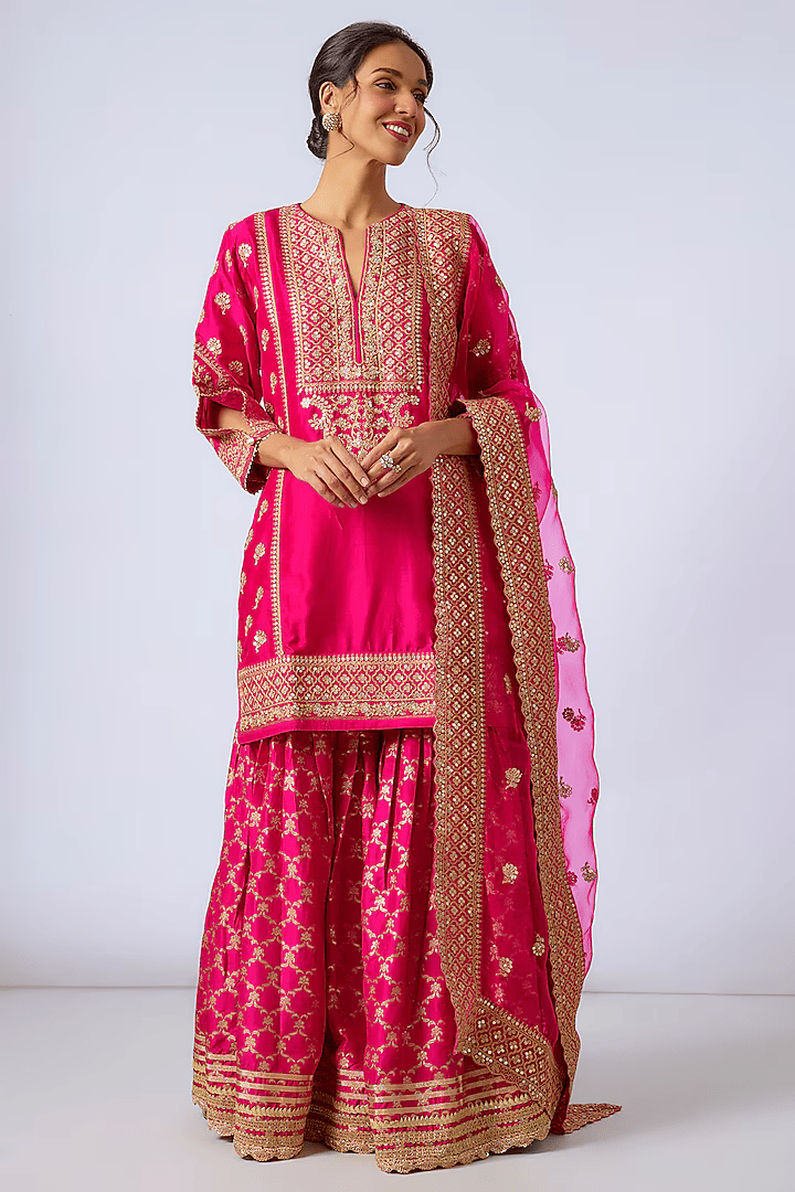 This cotton silk, short length, kurta is embellished with our signature gota and sequin work, highlighting the neckline. It is paired up with hand woven silk brocade flared garara on tussar and pure organza dupatta to complete the ensemble.