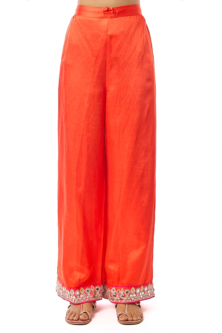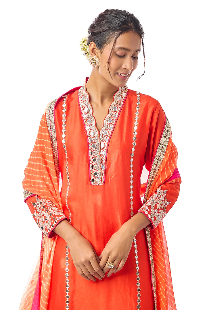 The kurta is beautifully adorned with delicate embroidery and mirror detailing along the neckline and borders, creating a sophisticated and festive look. Paired with a matching embroidered palazo and a sheer dupatta featuring intricate work.