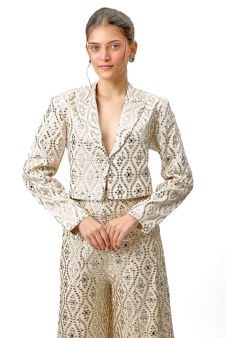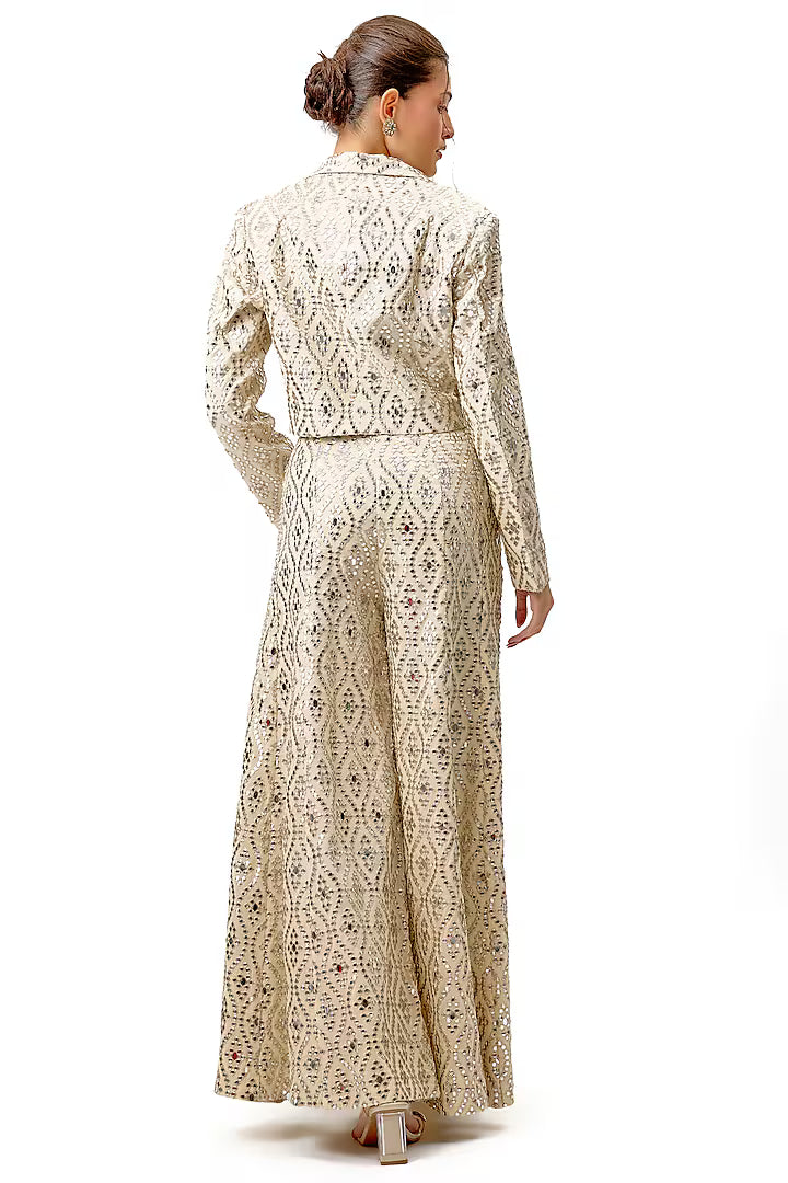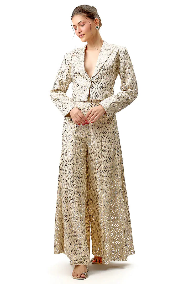 The tailored silhouette in katri mirror features geometric patterns, making it ideal for cocktail parties, formal gatherings, or red-carpet events. The flared pant style adds a touch of drama and movement, while the fitted bodice ensures a flattering, streamlined look.