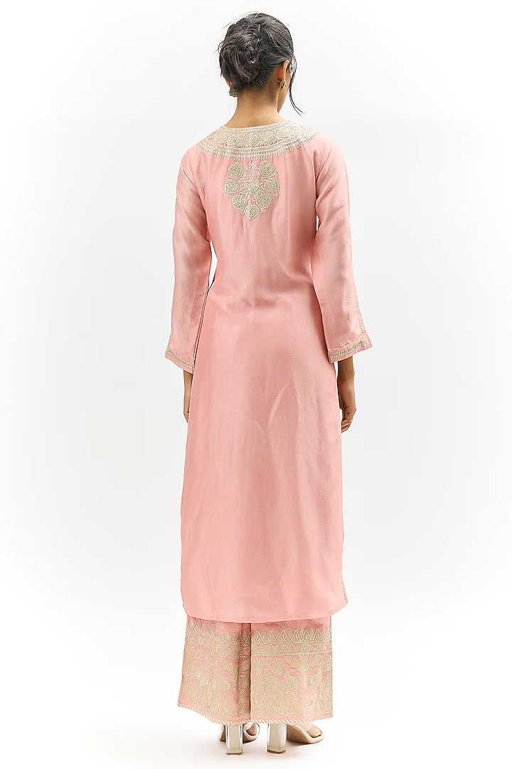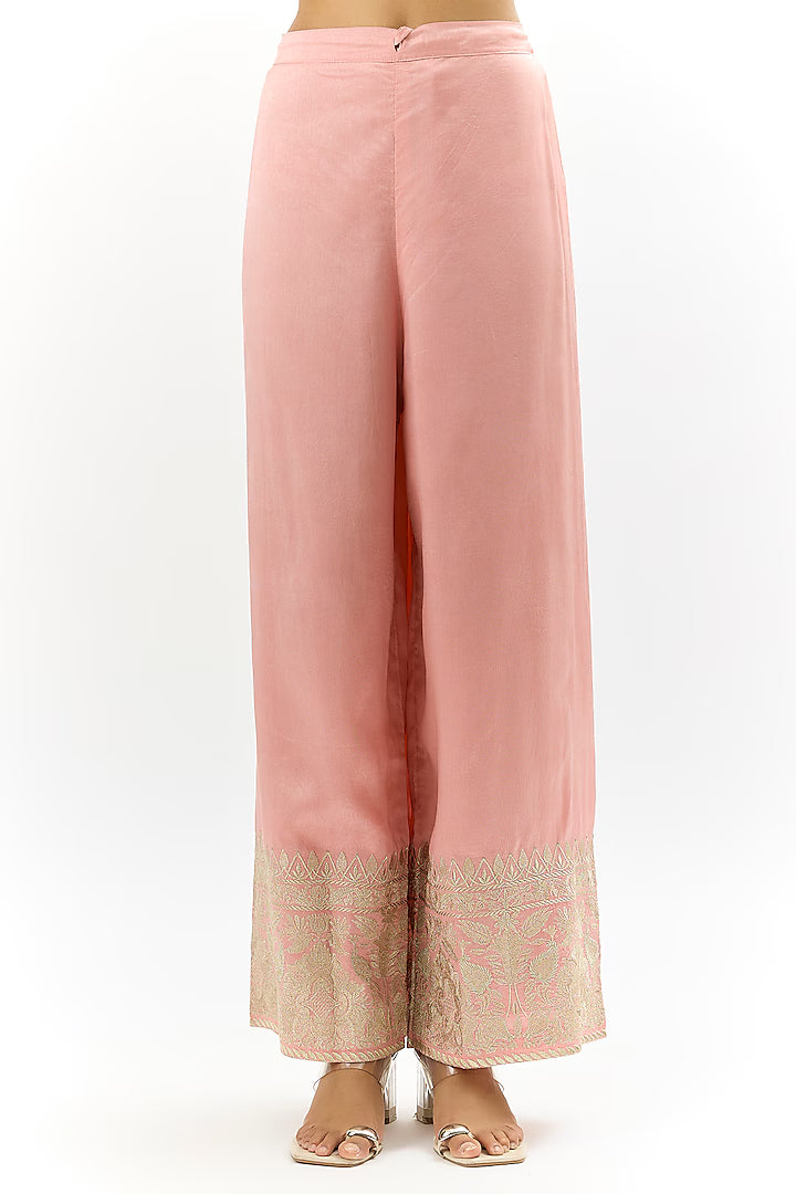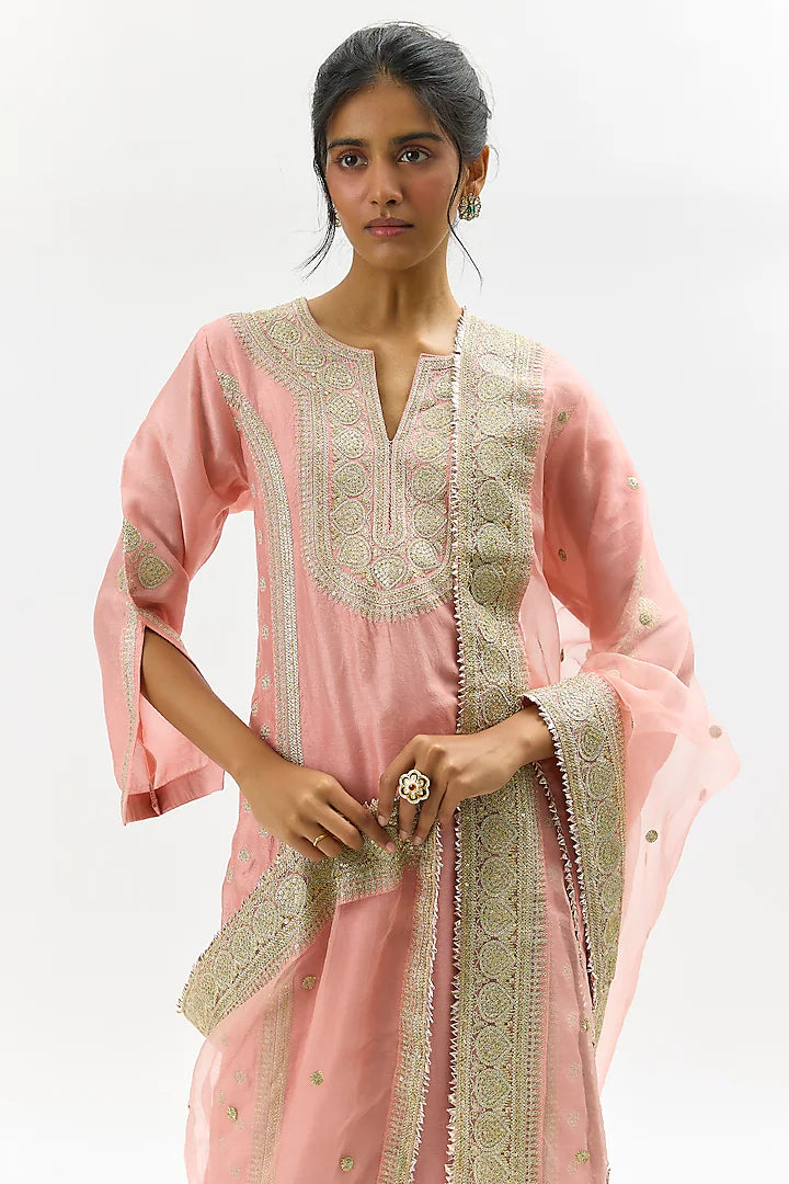 Muzafar Tunic set comes with a classic, straight cut kurta, embroidered palazzo pants and a pure, organza dupatta. In this rani outfit, the beauty lies in the feminine organza dupatta that gives richness to the outfit while the delicate dori and sequins buttis add the oomph of old world beauty.
