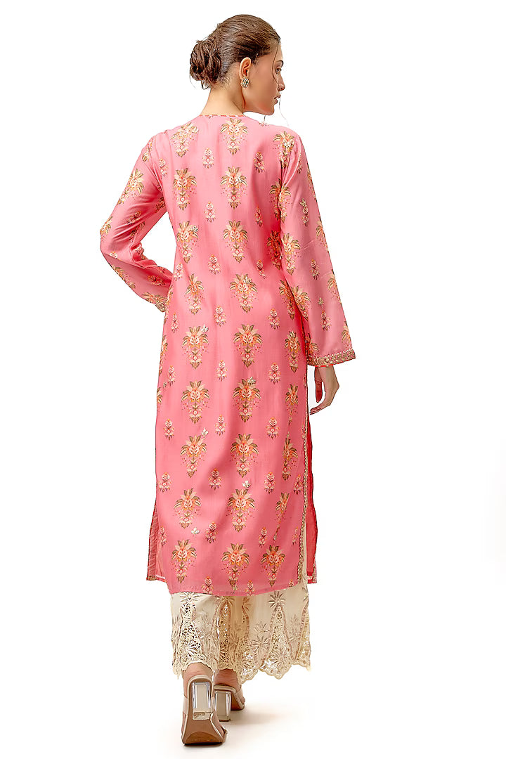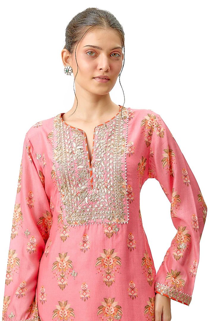 This Smart, Contemporary Collection Mixes A Strong Floral Print, All Delicately Enhanced Embroidery around the Neck . Add Shimmer And A Richness To This Pretty Ensemble. Long Sleeved Tunic Is Easy To Carry And Can Be Worn On Any Occasion.