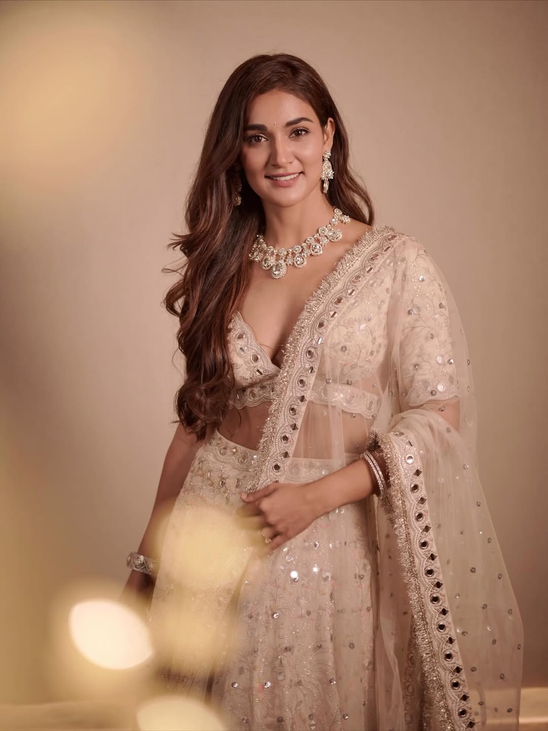 The heavily hand embroidered lehenga is adorned with intricate mirror work, delicate floral patterns, and thread detailing, creating a dazzling look. The plunging V-neck blouse features scalloped edges and matching embellishments. Complemented by a net dupatta with mirror border work.