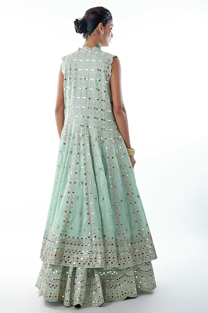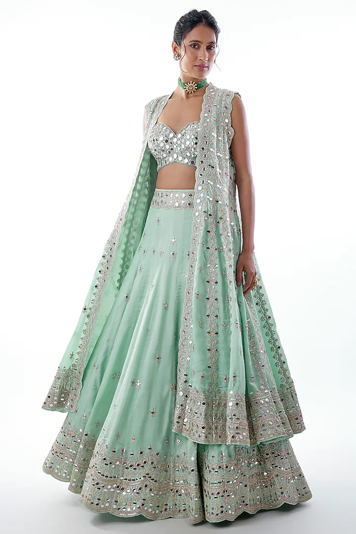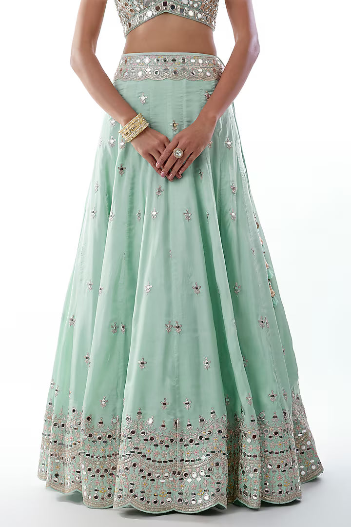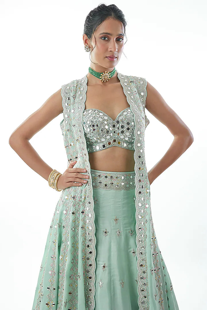 The ensemble consists of a heavily hand embroidered blouse with mirror work and tassels on the hem, complemented by a flowing lehenga with elaborate mirror embellishments and scalloped borders.A matching jacket with ornate detailing enhances the layered look.