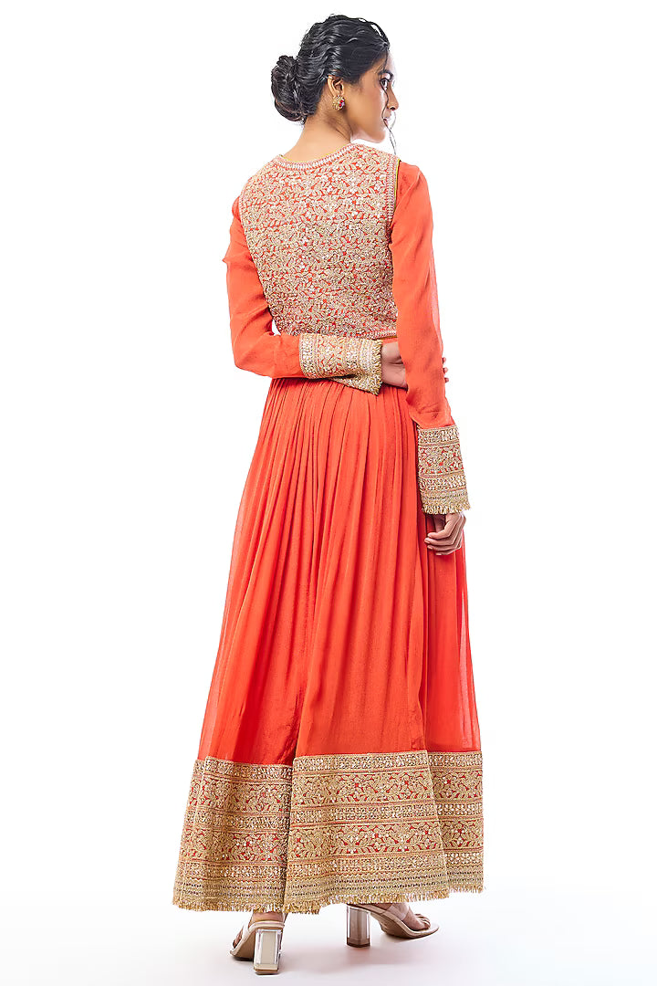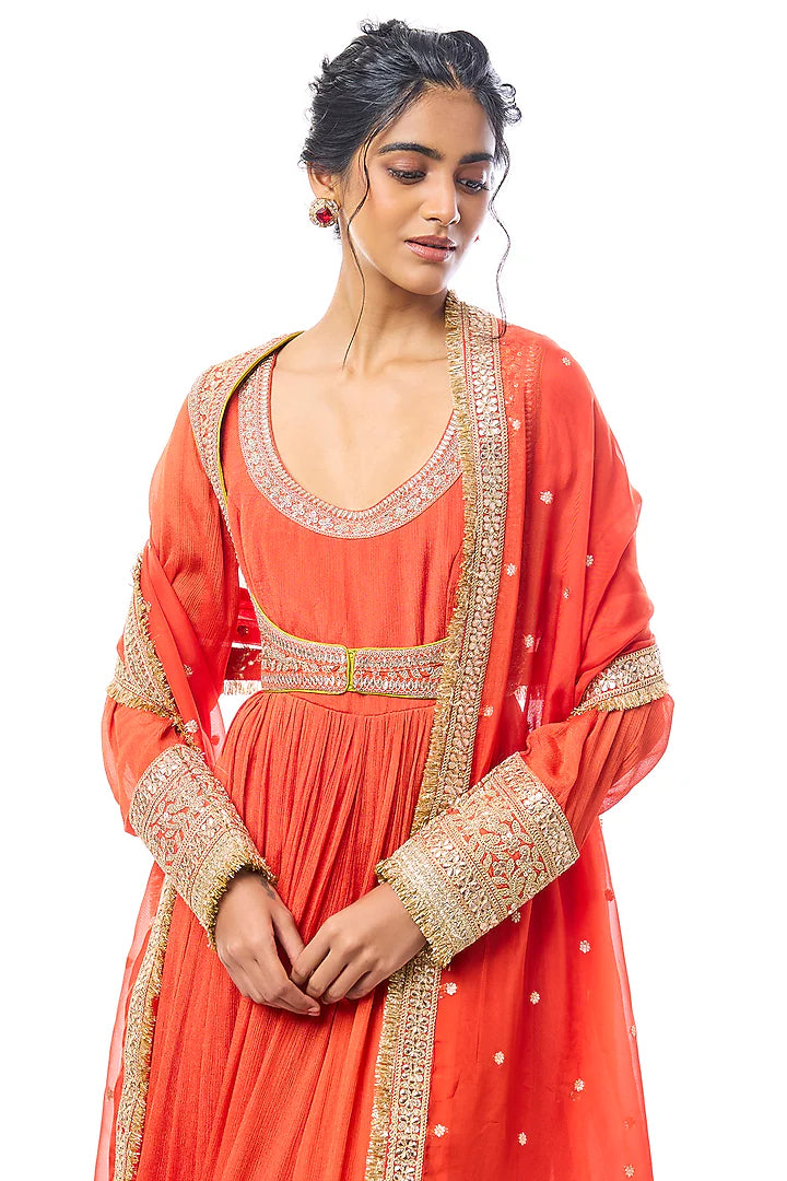 This exquisite Anarkali suit, designed with flared silhouette that exudes elegance and charm. The bodice and hemline are highlighted with intricate embroidery and embellished borders. The long sheer sleeves and coordinating dupatta, adorned with delicate motifs and a richly embroidered border, complete the look with sophistication.