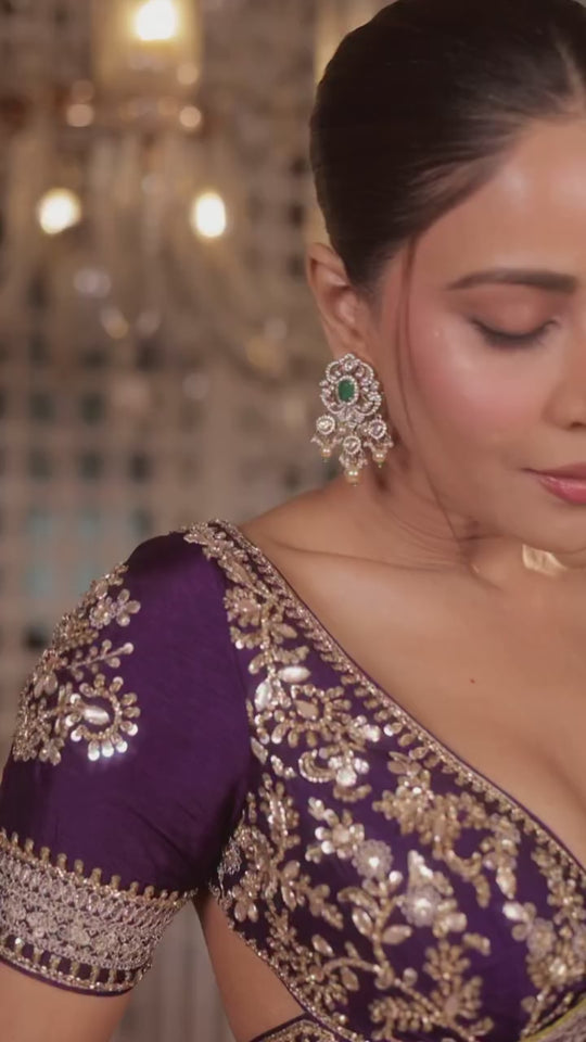 This regal saree exudes timeless elegance with its rich fabric and intricately embroidered details. The blouse is heavily embellished perfectly complementing the saree. The drape flows gracefully, showcasing a beautifully embroidered lower half with elaborate patterns that add depth and grandeur.