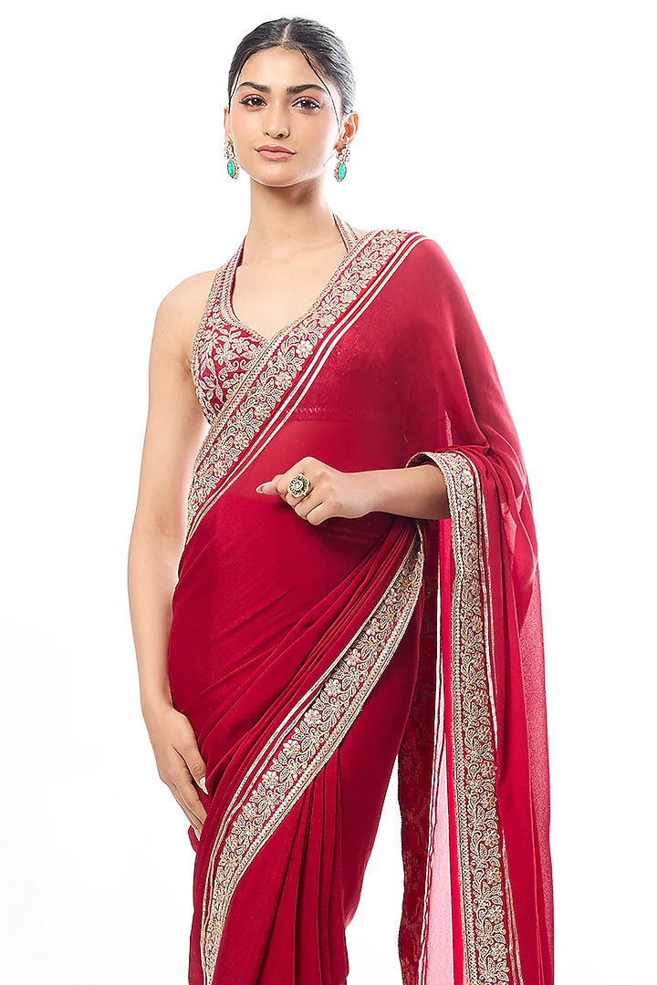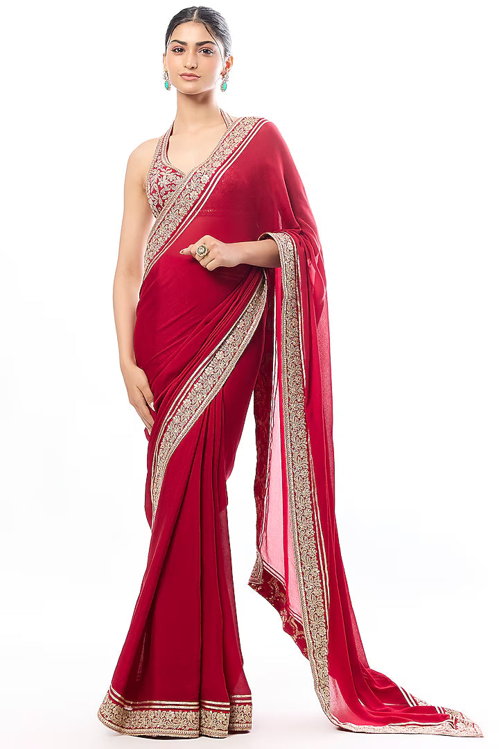 This classic red saree radiates effortless elegance and timeless appeal. Crafted from a lightweight, flowy fabric, it features a rich hue that beautifully complements its subtle accentuating the silhouette with refined sophistication. Paired with a sleeveless blouse that mirrors the border’s embroidery, the look strikes the perfect balance between minimalism and festive charm.