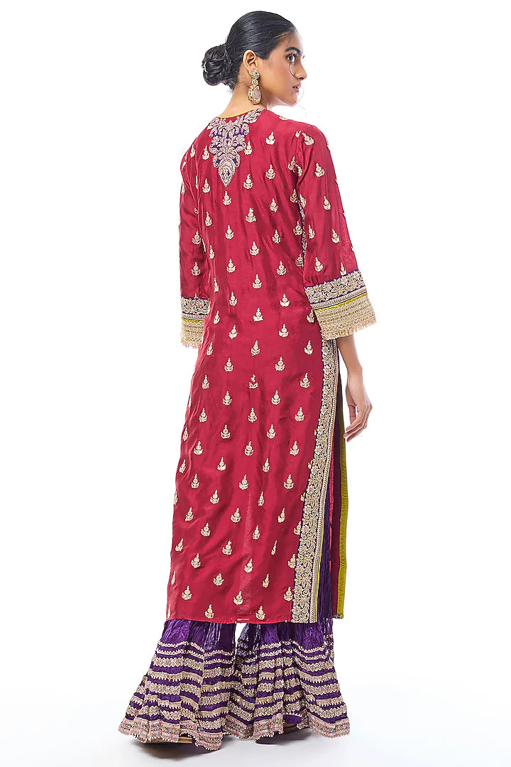 The straight-cut kurta features intricate work along the neckline and cuffs, with scattered motifs enhancing its regal appeal. Paired with a striking contrast crinkled sharara the ensemble balances bold color play with traditional charm. The sheer matching dupatta, finished with an embellished border and delicate motifs, completes the look with grace.