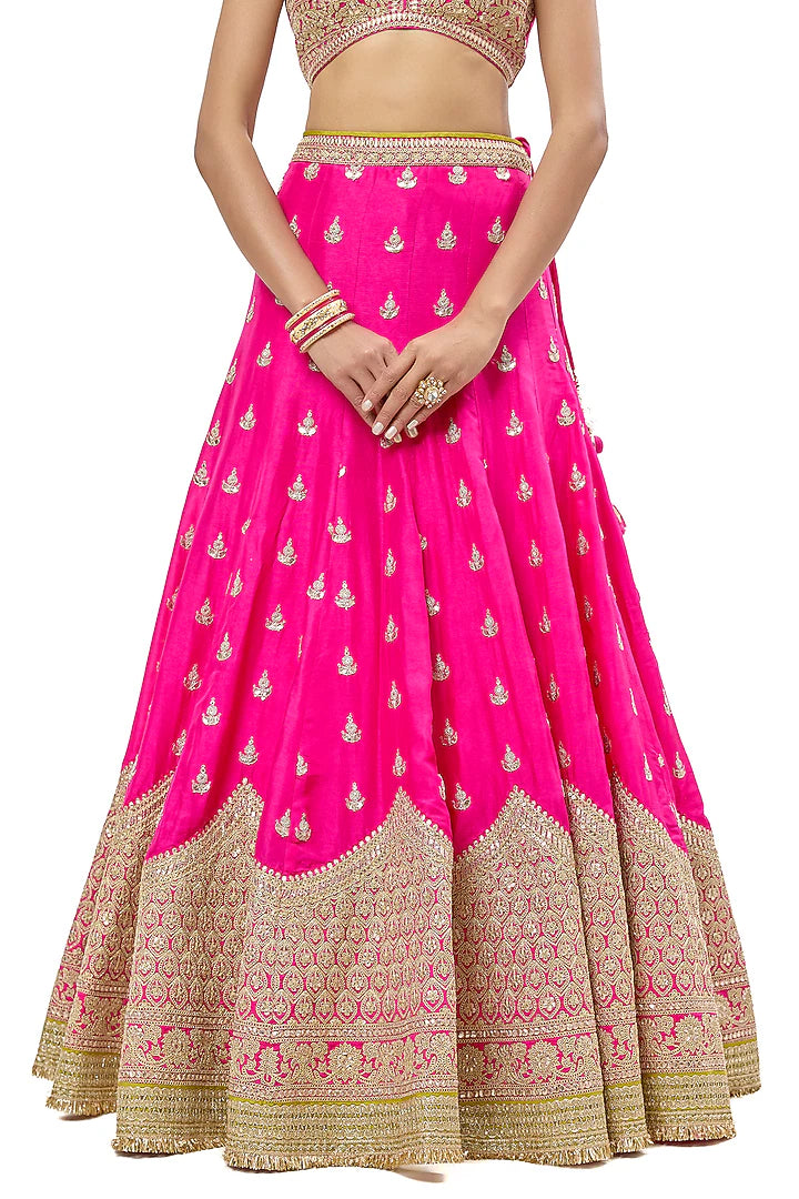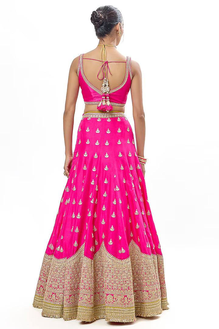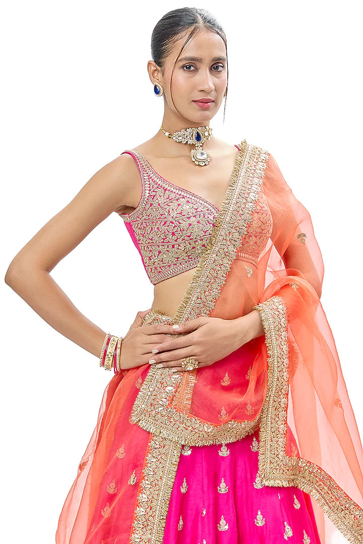 This elegant lehenga set radiates regal charm, featuring a beautifully embroidered blouse with intricate detailing paired with a deep neckline for a modern touch. The voluminous lehenga is adorned with delicate motifs scattered across and a richly embellished border that enhances its grandeur. A contrasting sheer dupatta with ornate embroidery and a finely detailed border completes the look.