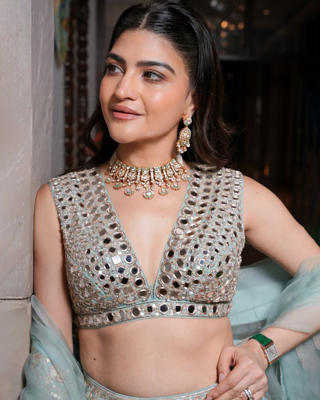 This dreamy lehenga set features a hand embroidered V-neck blouse with intricate mirror work and voluminous lehenga embroidered with threadwork. Paired with organza dupatta with mirror detail along the border and subtle gold accents, adding charm.